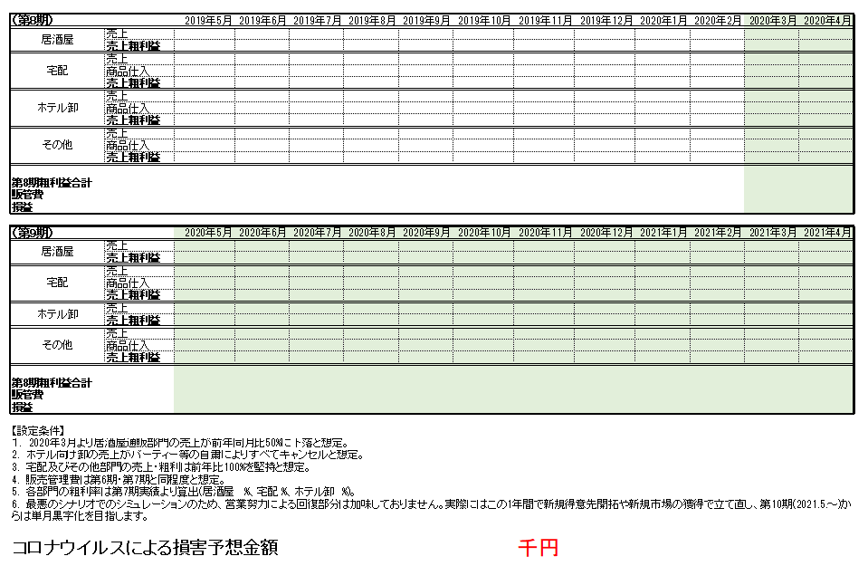 弊社の場合は最悪のシナリオを想定して、ここから1年間居酒屋応援隊の売上が半分になり、別部門のホテル・レストラン向け卸の売上が宴席の自粛により全部キャンセルになった場合という過程で売上を予想し、それに対しての各月の費用(販管費)を入れて損益を計算してみました。数値を入れる前の表がこちら↓です。