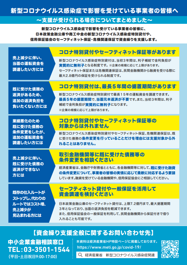 経済産業省の新型コロナウイルス感染症関連特集ページからダウンロードできます。https://www.meti.go.jp/covid-19/pdf/shien-flyer.pdf