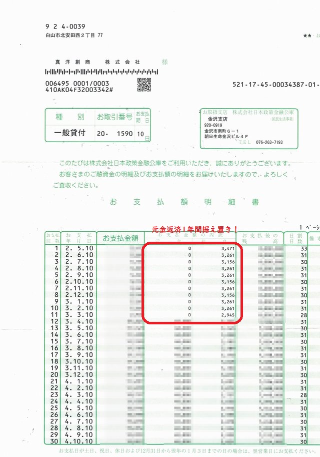 そして4/8(水)に実際に融資の実行(借入金の振込)があり、後日いわゆる返済予定表が郵送されてきました。それがこちら↓