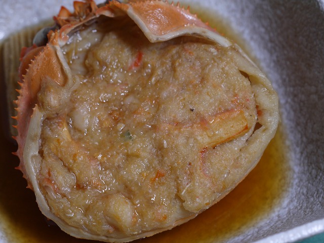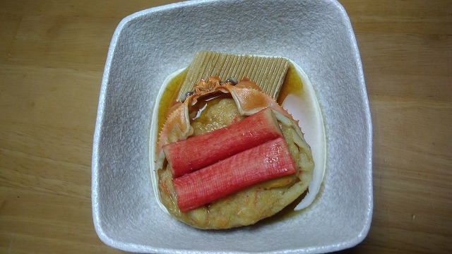 本物の香箱ガニを丸ごと使うとそれだけでお高くなりますので、富山県産のベニズワイガニの甲羅にベニズワイガニのむき身としんじょうを混ぜ合わせたものを詰め込みました。調理前は物足りない分量に見えますが、煮込んで頂くと下の画像のようにふっくらと仕上がります。