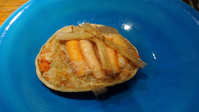 11月初旬のズワイガニ漁解禁から年末までの短い期間だけ入荷する香箱がに(ずわいがにのメスを北陸ではこう呼びます。)の内子、外子とほぐし身を混ぜ合わせて面(カニの甲羅)に詰め込んだおでんダネです。やはりこれは金沢らしいので、観光客の方は我先にと注文していました。時価というところも気にせずに・・・。