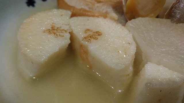 左上が車麩という加賀料理には欠かせない麩、左上がバイ貝です。そして手前の左がえびしんじょう、右が定番の大根です。ご覧のとおり、お出汁は薄目の味付けになります。