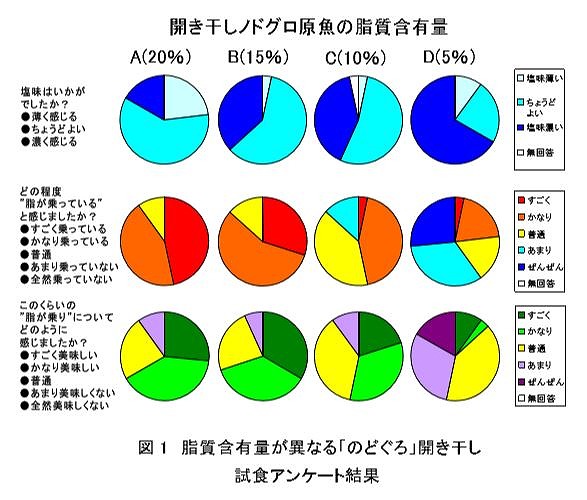 脂質含有量の異なる「のどぐろ」の 試食アンケート結果を図 1(個別の意 見は表 1)に示しました。 “塩味”についての問いでは、脂が多ければ、やや塩味が薄く感じられる傾向が認められました。つまり、「のどぐろ」で美味しい開き干しを作製する際は、塩分を脂質含有量ごとに調整することが必要と考えられました。次に脂の乗り具合と、それに対する官能評価(美味 しいと感じるか?)の問いでは、脂の乗りは脂質含有量が多いほど実感できるものの、美味しさとの関連性でみると、A、B、C でそれほど大きな差が認められず、Aよりも、むしろBの方が高評価でした。