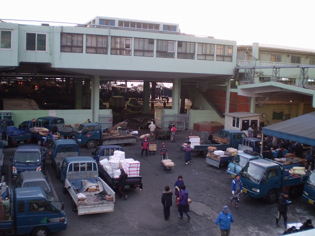 ※韓国・プサンの魚市場にて。こんな感じで木箱にドカッと入ってきていました。この時は冬で気温がマイナス10度くらいだったので、搬入される魚が市場に置いておくだけで徐々に凍っていっていました。