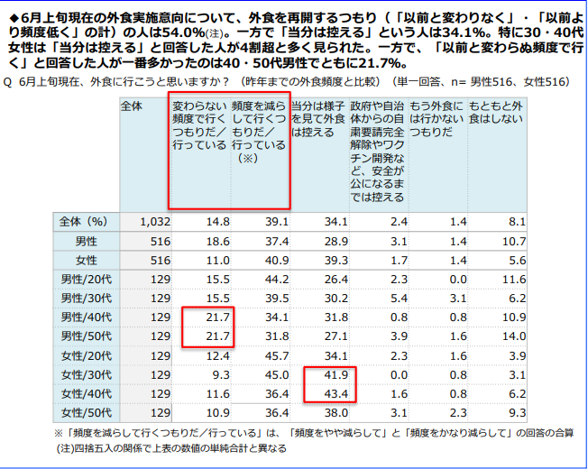 上の表を見て頂くと歴然としているのですが、緊急事態宣言が解除されたので外食を再開すると回答した人はたったの14.8%。「今までより頻度を減らして行く」と答えた人が39.1%で両方を合わせて頻度は関係なく外食を再開すると回答した人の合計でもも53.9%と半数程度・・・。この結果から見ると、当面は今までと一緒のことをしていると昨年対比で50%以下の売上しか見込めないということが推定されます。