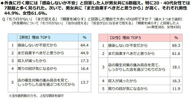 「感染しないか不安」という感染リスクに対する不安と「まだ自粛すべきと思うから」という(万が一感染した場合の)社会的非難を避けたいという動機が外食を積極的に再開しようとしない大きな要因になっているようですね。第2位の「まだ自粛すべきだと思うから」というのは漠然とした不安なので対処は難しいのかもしれませんが、不安要素トップの「感染しないか不安」というところの解消は積極的に取り組んでいきたいですね。