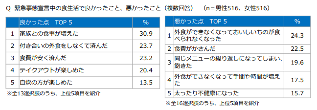 最後に「外食に行かなくなって良かったこと、悪かったこと」です。我々が注視すべきはやはり「悪かったこと」。要は外食できなくて辛かったことですから。今回のコロナ騒動で人々の意識や行動様式が変わった、とよく聞きますが、自粛要請期間に外食をしないという体験をした消費者が感じた「外食をすることの価値」がまさにこれだと言えます。